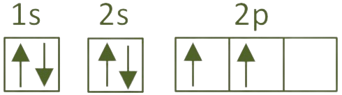 Pero normalmente forma cuatro enlaces y, para poder hacerlo, necesita promocionar un electrón del orbital 2s al 2p para tener otros tantos electrones desapareados. Como son orbitales del mismo nivel, necesita poca energía para poder hacerlo y lo compensa con creces a posteriori cuando forma los cuatro enlaces: