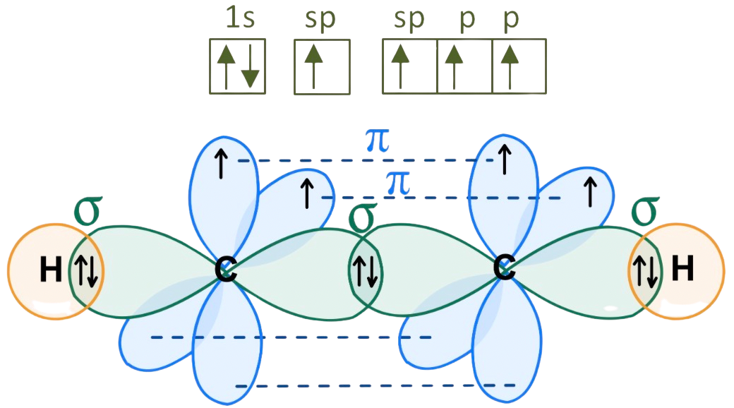 o laterales con un solapamiento mucho menor. Para formar estes últimos enlaces se reservan orbitales p del átomo de carbono y, por lo tanto, se hibrida el orbital s y uno de los p: