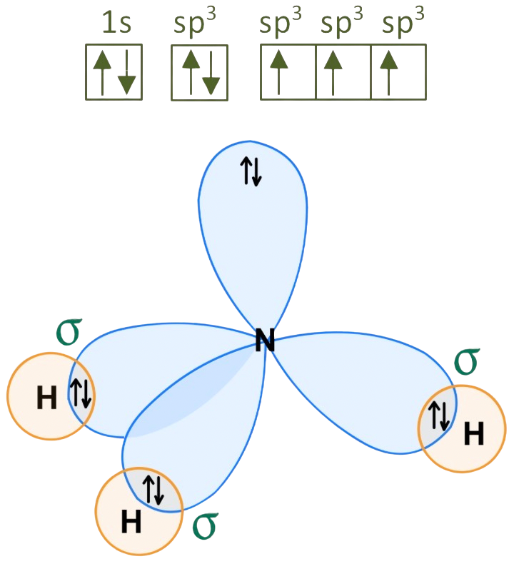 d) Nitrógeno con hibridación sp3: esta hibridación la presenta el amoníaco (