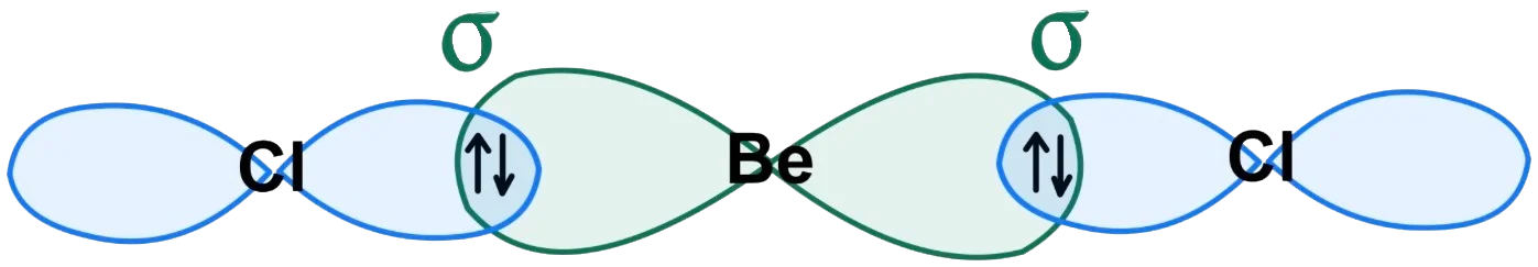 Los orbitales dos orbitales híbridos sp del berilio, cada uno con un electrón, solapan con los orbitales p del cloro que también tienen cada uno un electrón.