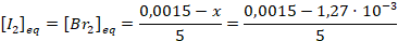 , con una Kc = 120. En un recipiente de 5,0 L de capacidad se introducen 0,0015 moles de yodo y 0,0015 moles de bromo, calcule: