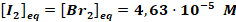 El primer resultado no es válido, porque hace que obtengamos moles en equilibrio negativos tanto de yodo como de bromo. A partir del segundo valor obtenemos las concentraciones que nos piden.