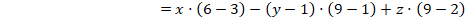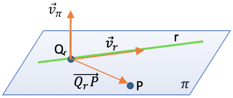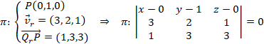 Para calcular la ecuación del plano necesitamos dos vectores (contenidos en el propio plano) y un punto. Los dos vectores los obtenemos, uno del vector director de la recta y el otro haciendo un vector que va desde un punto cualquiera de la recta, Qr, al punto P por el que tiene que pasar el plano: