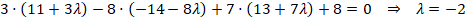 Ahora vamos a calcular el punto M, es decir, el punto donde esta recta corta al plano. Para ello substituimos las ecuaciones paramétricas de la recta en el plano: