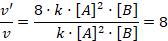 Efectivamente se comprueba que la velocidad de reacción aumenta 8 veces si duplicamos la concentración de los reactivos.