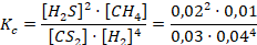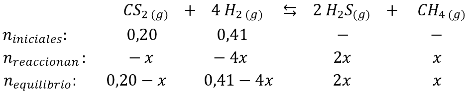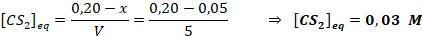 En un reactor de 5 L se introducen 15,3 g de CS2 y 0,82 g de H2. Al elevar la temperatura hasta 300 0C se alcanza el siguiente equilibrio: , donde la concentración de metano en equilibrio es de 0,01 mol/L.